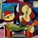 De wens was: interpreteer een schilderij van Pablo Picasso op eigen wijze. De opdrachtgever woont aan de Pablo Picassostraat, vandaar deze wens. De opdrachtgever heeft een kat, dus ik heb een kat aan het schilderij toegevoegd. Het is 100 x 100 cm groot.