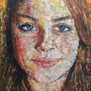 2023In opdracht geschilderd met verzoek: schilder een modern lijkend portret op een losse manier met warme kleuren. Het is 100 x 100 cm groot.